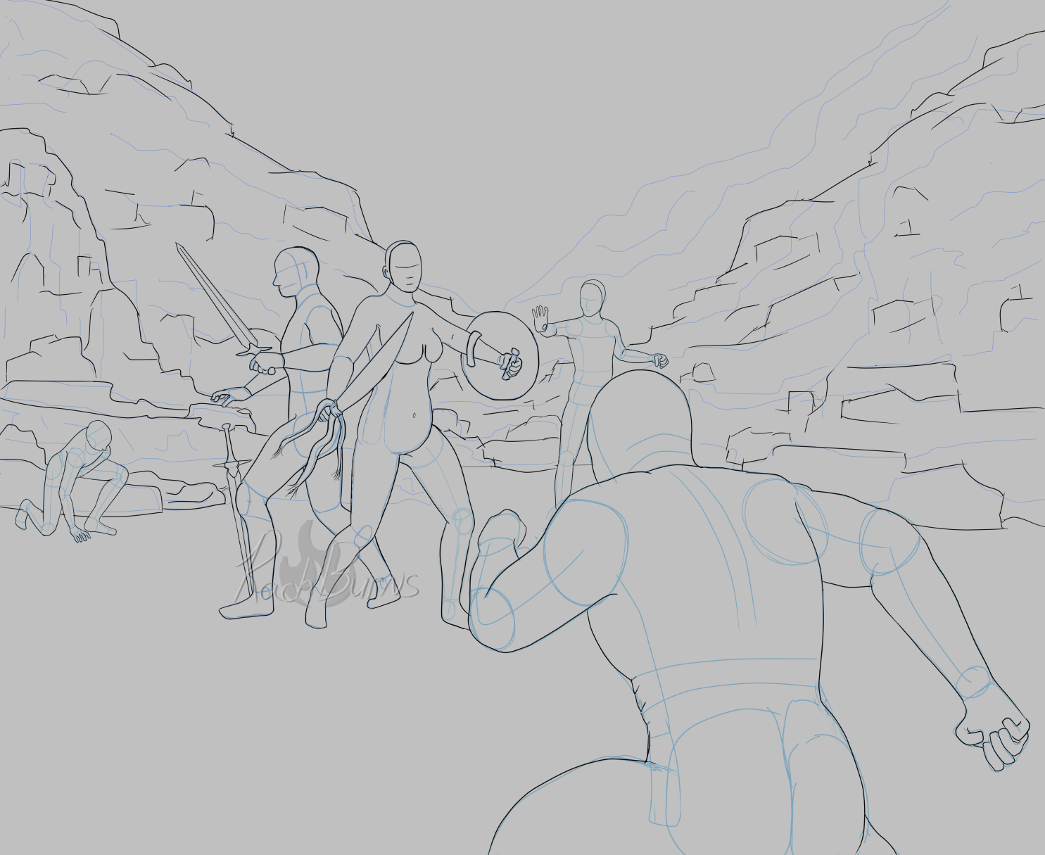 The mountain has let itself be a little more lined. It no longer looks like melting icing! It’ll definitely look better come some grayscale and paint, but I’m pleased with the lines right now.