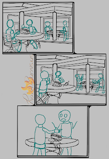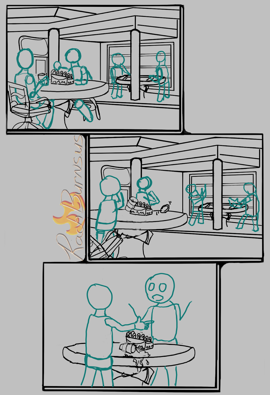 Tip #2: Did you know that for thumbnail images on a comic thing, you don’t have to use such strong attempts at perspective? I played a little too literally here and let it have too much focus, but I can’t say that I’m upset with playing with the gestures. In a few days, I might go over the gestures at the far table again since Find the Way did better showing Valeon’s action than this one did, but these are complete!