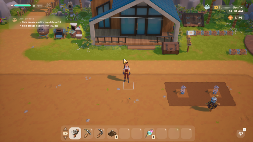 And here is the yard at the moment. Love how the outside of the house looks! Haven’t been messing with growing plants as of now but glad the sprinklers work like they should be. And the scarecrow is clearly guarding the whole section, right? XD Protecting those scared sprinklers, surely.