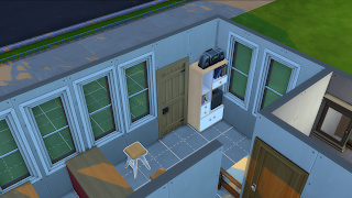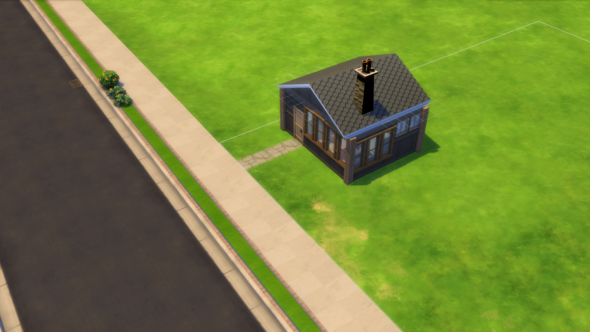 Have to thank the Dream Home Decorator pack for this. In the bedroom, I was able to fit what I hope is a comfortable-enough bed with a little area for a laptop. Because everything works on the internet, even in this game, so that was very exciting to get to fit this area in that small room. It’s not such a wasted area in this case. (And I was still riding the high that fitting the television in the living room gave me at this point.) So I decided to go upstairs and set up a roof that would fit that small place.