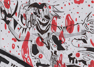 They drew this SCP in an interesting way. I think I like the red overlapping the black in this piece, because it’s clearly more than just blood here, maybe a kind of oil–look at how it’s dolloped all around? Makes me wonder if it maybe had woke to attack other SCPs.