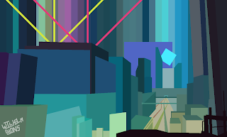 I thoroughly enjoy the colors used in this piece. Take a look at the lights coming from the roof of the nearest building! They’re perfect! They remind me of something we’d see in a more metropolitan city.