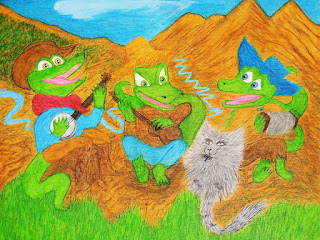 Aha, these fellows! I can’t tell if their furball friend is a dog or a cat but I enjoy how furry the animal looks. There’s hint of them having been at Splash Mountain in the comments on the piece, too. If it was an actual show, I bet that it was a very nice one.