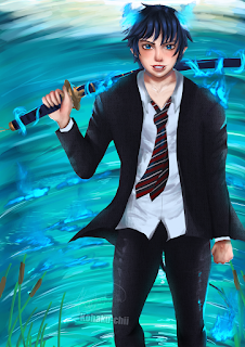 That background behind Rin is amazing, I love it. And I do wonder how she was able to paint it this way? Bringing our eyes forward to the character is just as awesome, I love how well she drew Rin’s form and had his clothing flying with the powers around him.