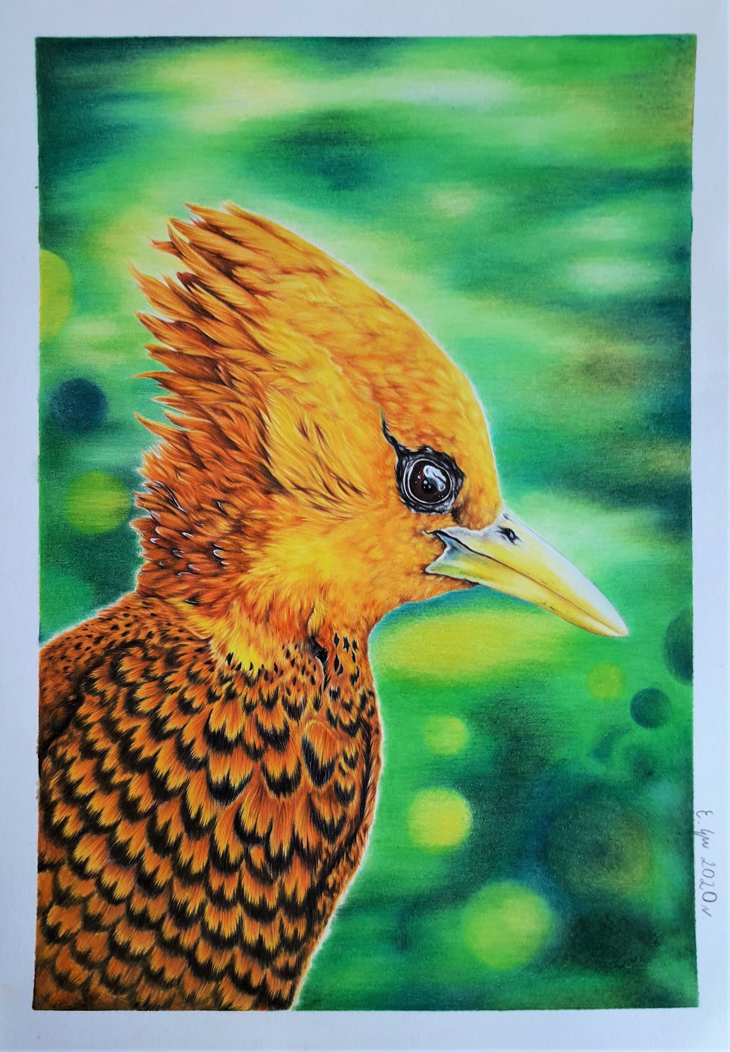 I love that bit of color in the background, here! To me, it looks like we’re focused on the bird so the leaves of the tree that it’s in are a bit blurred together. And doesn’t that color set off those yellow feathers? I can’t imagine the amount of work doing those feathers needed. This was done in colored pencil, too. So, I have to say it again. There should be so much respect to the traditional artists who do pieces like these!